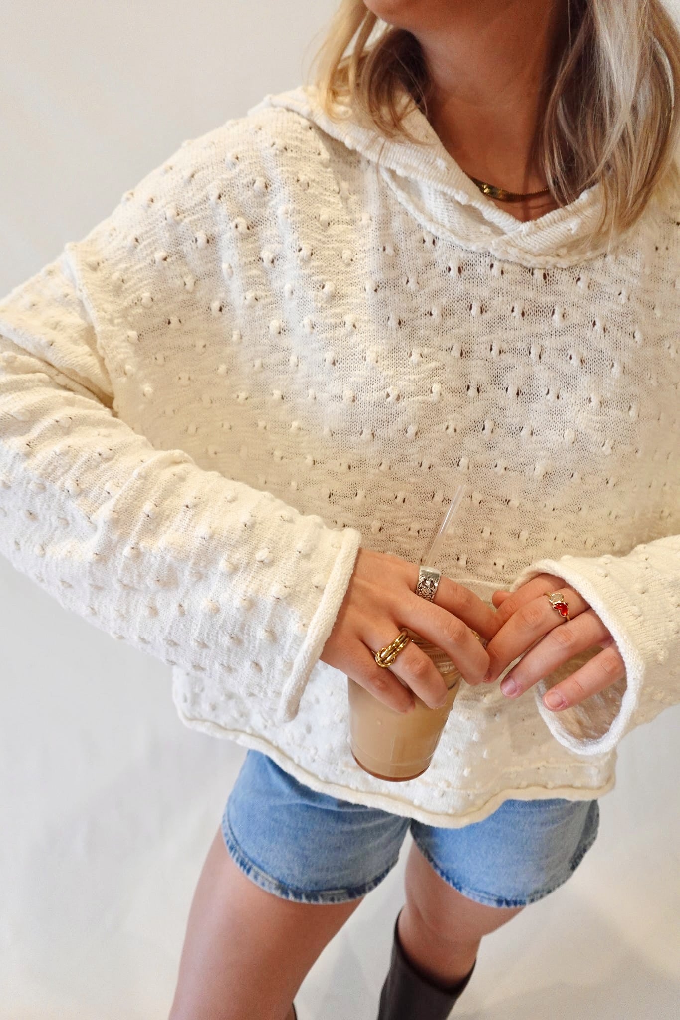 Whether you're running around town or lounging at home, this sweatshirt works for both. The Free People Lake Side hoodie features a textured dotted knit, attached hood, kangaroo pocket, relaxed drop-shoulder long sleeves, and rolled hem. It has a relaxed, oversized fit.
