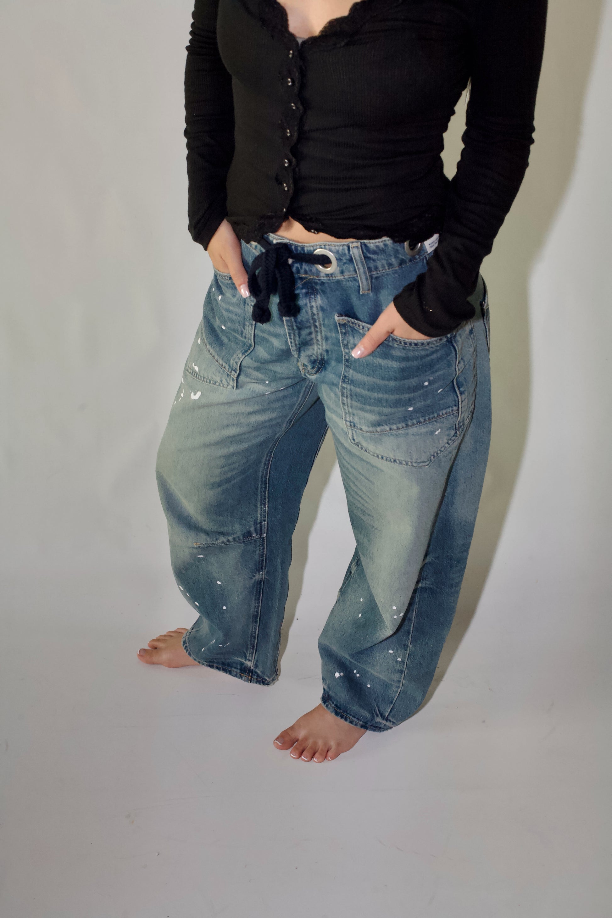 Features: Distressed detailing throughout, paint splatter features, oversized patch pockets, contrast drawstring waist, pull-on style