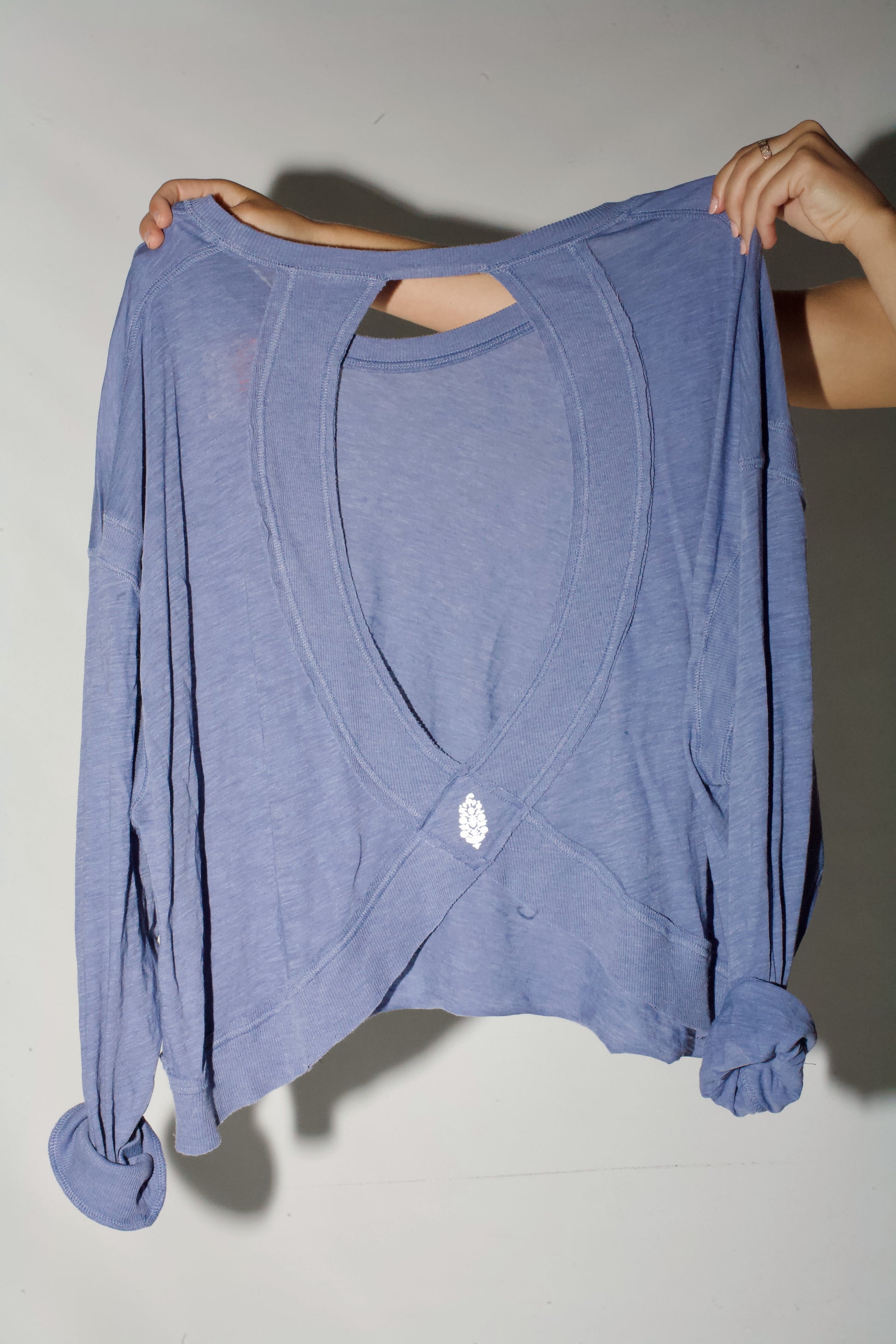 Features: Slight crop, longer sides; wide neckline; open-cut back; ribbed wrist detail