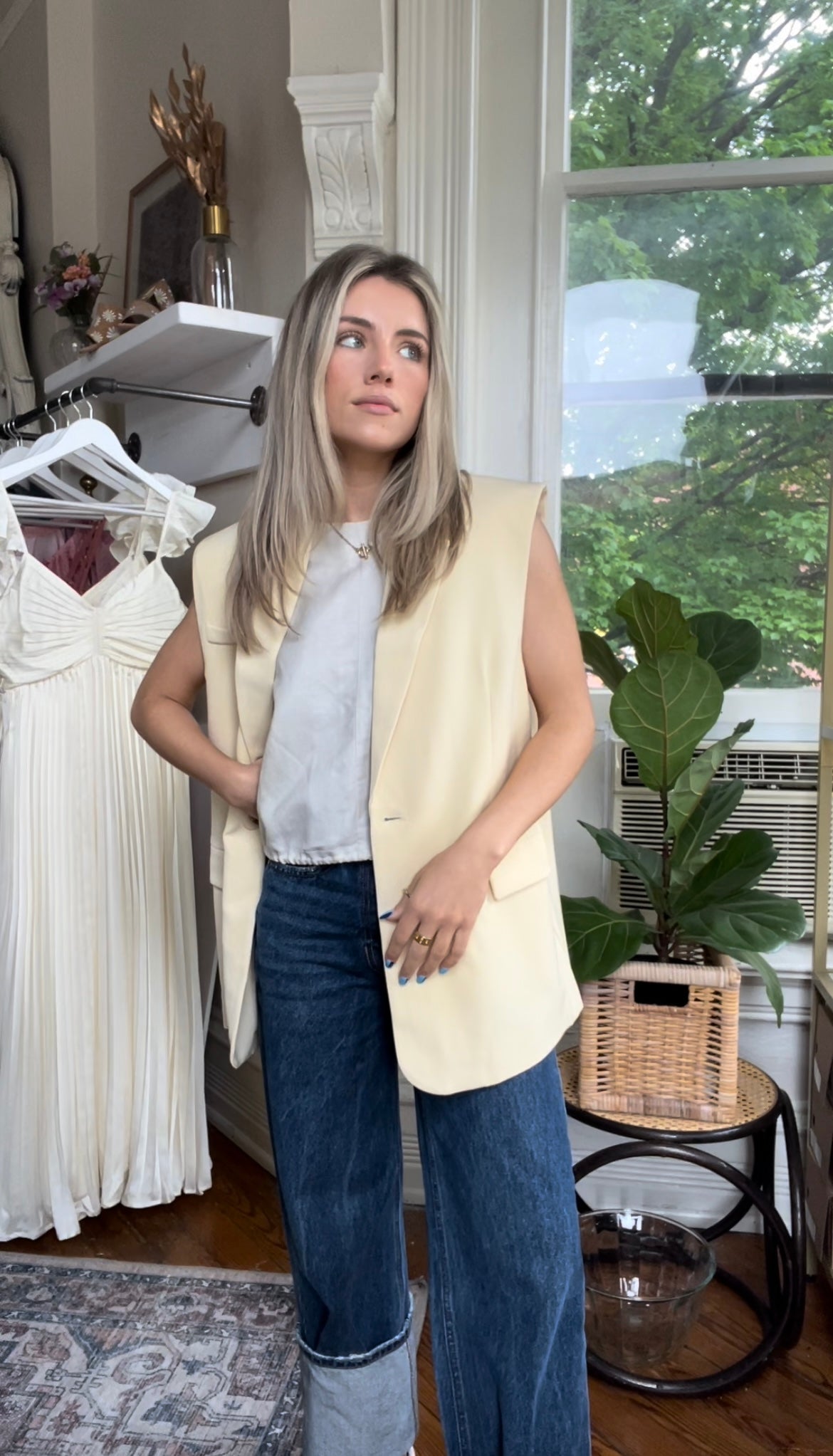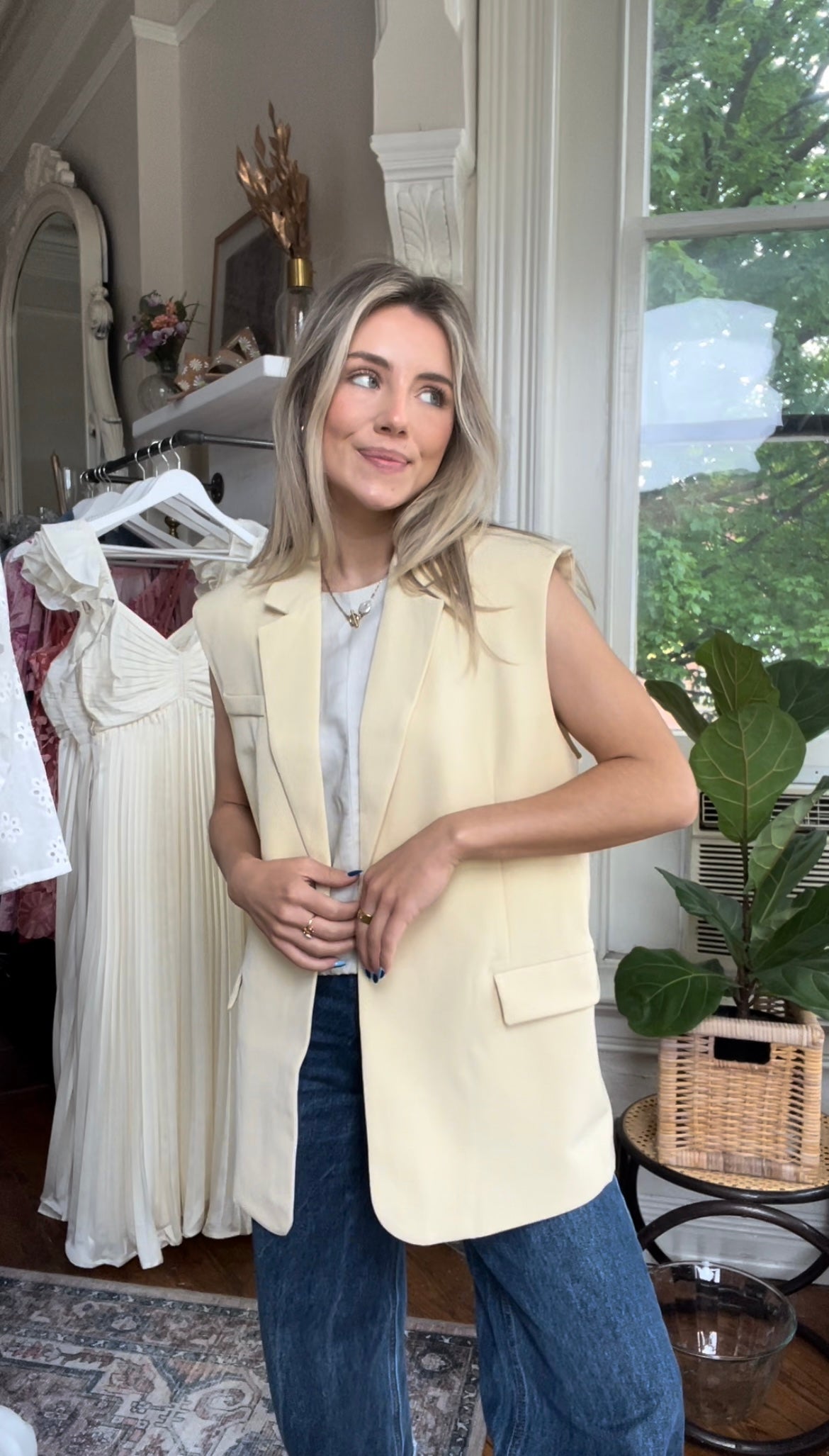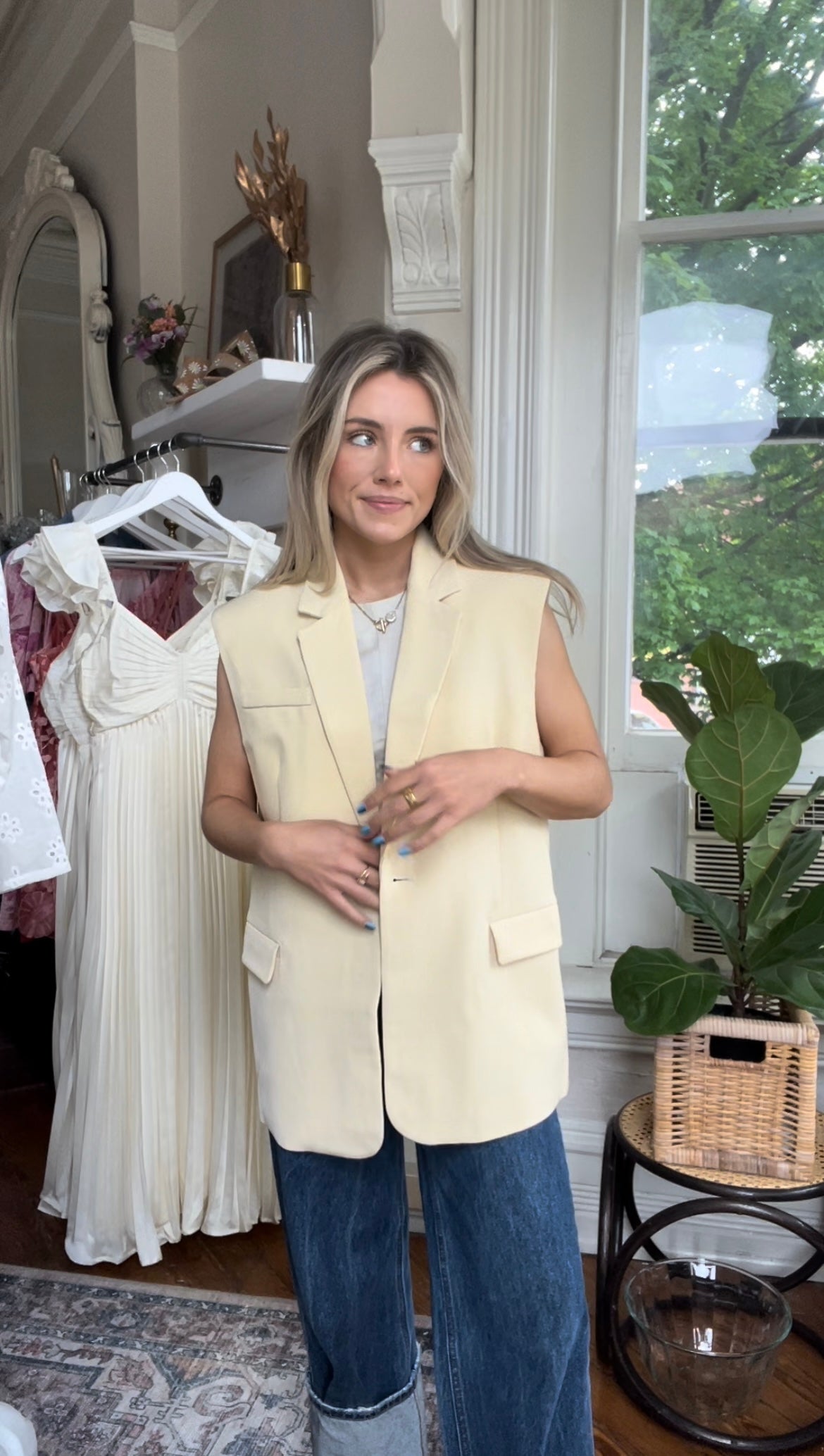 Our Soho Sleeveless Blazer Vest in sunny yellow is the perfect mix of fun and sophistication. suited for warmer or cooler weather, this vest features a front button closure and multiple pockets for convenience. The slit in the back adds a touch of intrigue while the full lining ensures a polished look. Adding personality into your work wardrobe has never been easier!